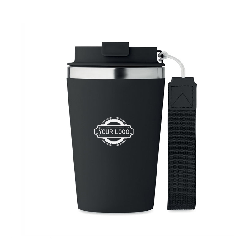 Kubek z podwójnymi ściankami z recyklingowanej stali nierdzewnej (90% recyklingowanej stali nierdzewnej i 10% stali nierdzewnej) z zewnętrzną warstwą z PP i paskiem na nadgarstek z RPET. Pojemność: 350 ml.