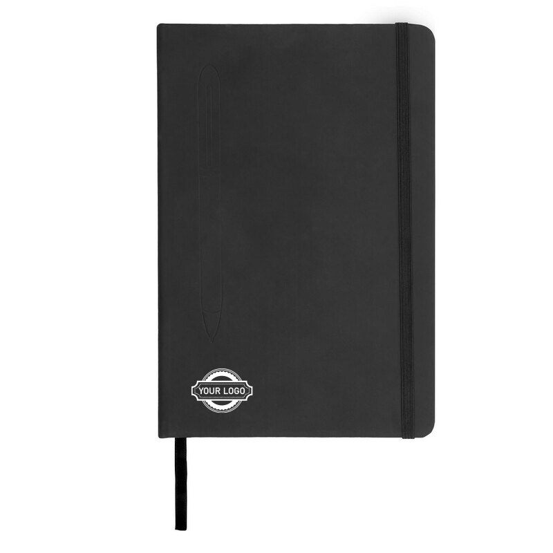 Notatnik A5 (80 kartek w linie), twarda okładka z PU z wbudowanym magnesem umożliwiającym przyczepienie przyborów do pisania (nie dołączone), tasiemka zakładkowa i elastyczna opaska do zamykania