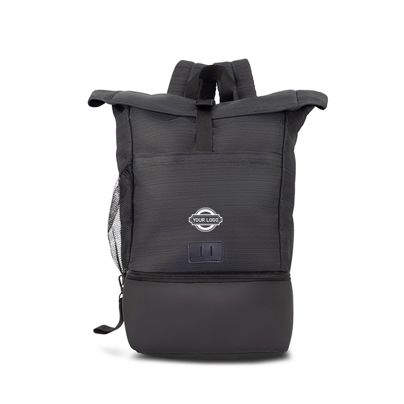 Plecak termoizolacyjny z przegrodą główną zamykaną na klamrę, pojemność: 15L, dolna przegroda termoizolacyjna mieszcząca do 8 puszek 0,33L zamykana na zamek błyskawiczny, boczna kieszeń siateczkowa, przednia kieszeń na rzep, na plecach kieszeń zamykana na zamek błyskawiczny, pasek do zamocowania na torbie podróżnej, miękki tył i regulowane paski na ramię.